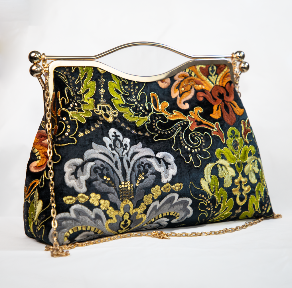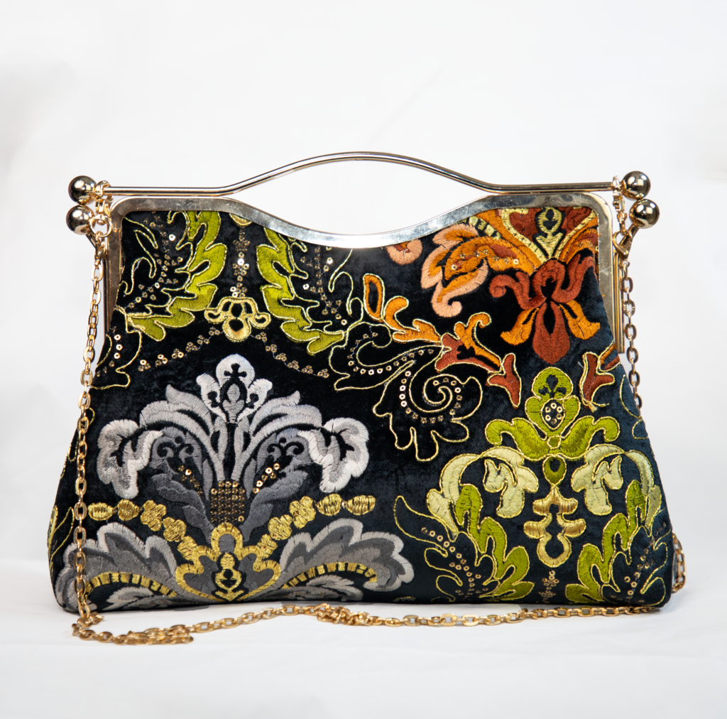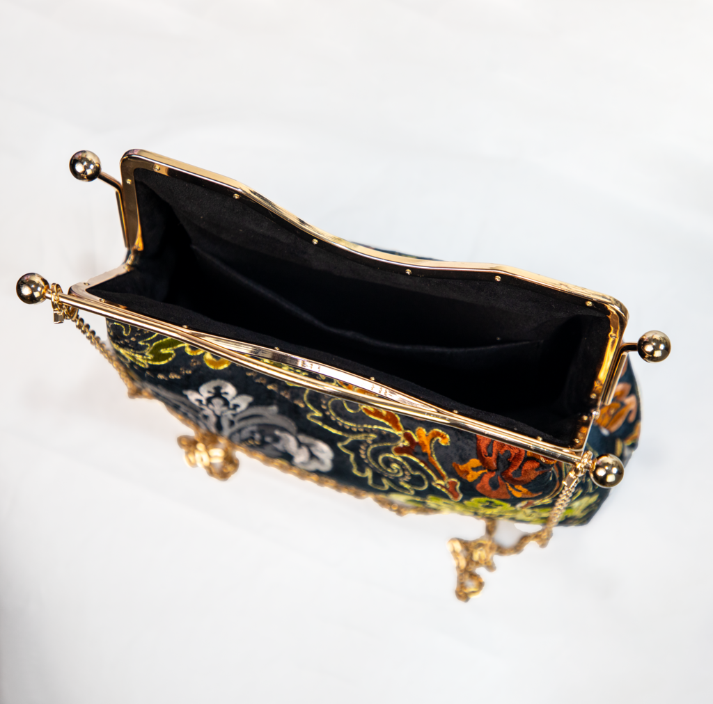 Un sac en brocart somptueux aux motifs baroques multicolores, avec un fermoir doré et une poignée rigide métallique. Élégance et originalité garanties.