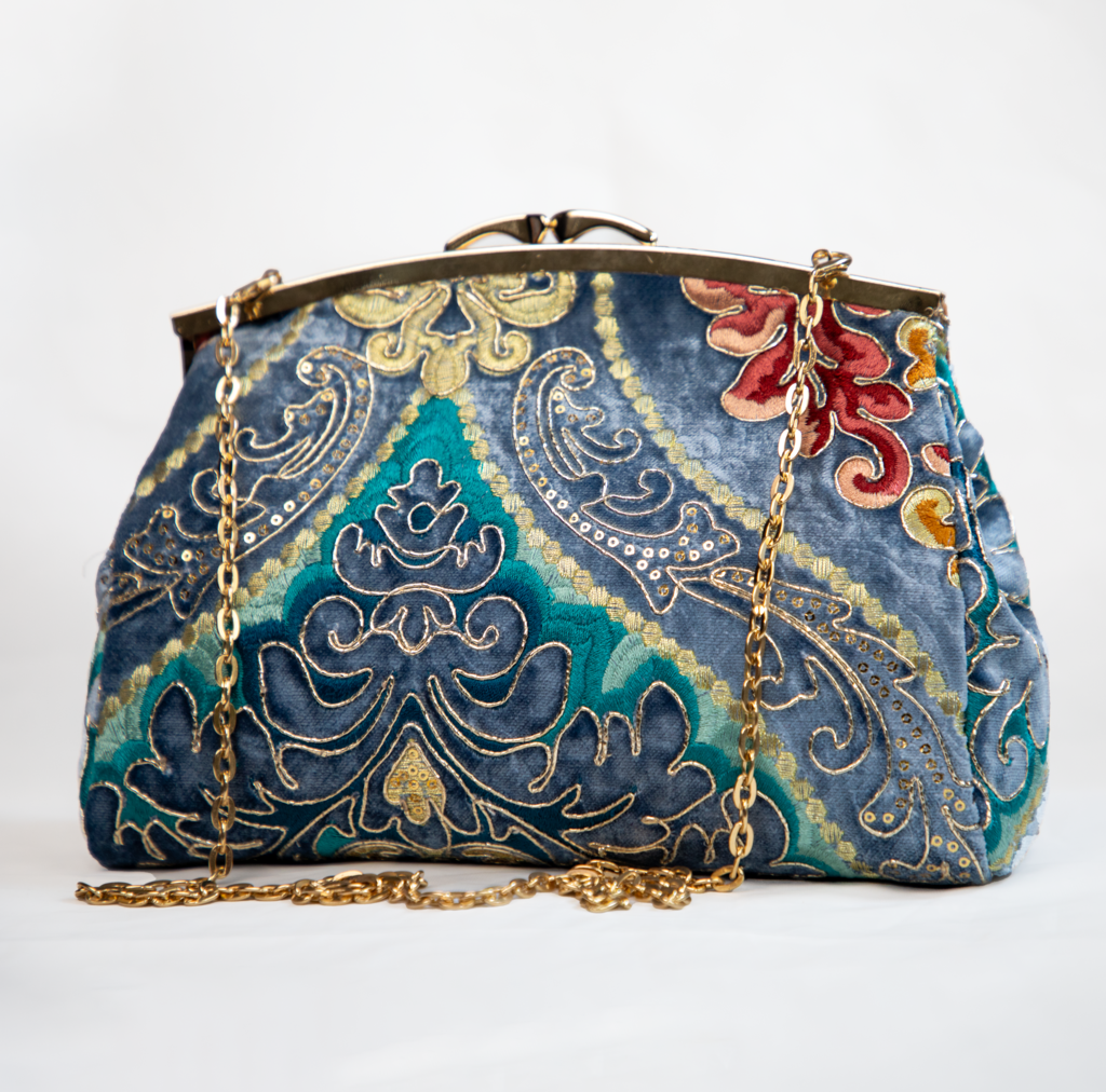 Un sac somptueux brodé de motifs orientaux multicolores sur velours bleu nuit. Une pièce maîtresse pour les grandes occasions.