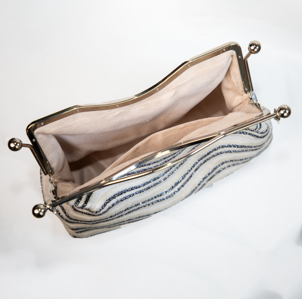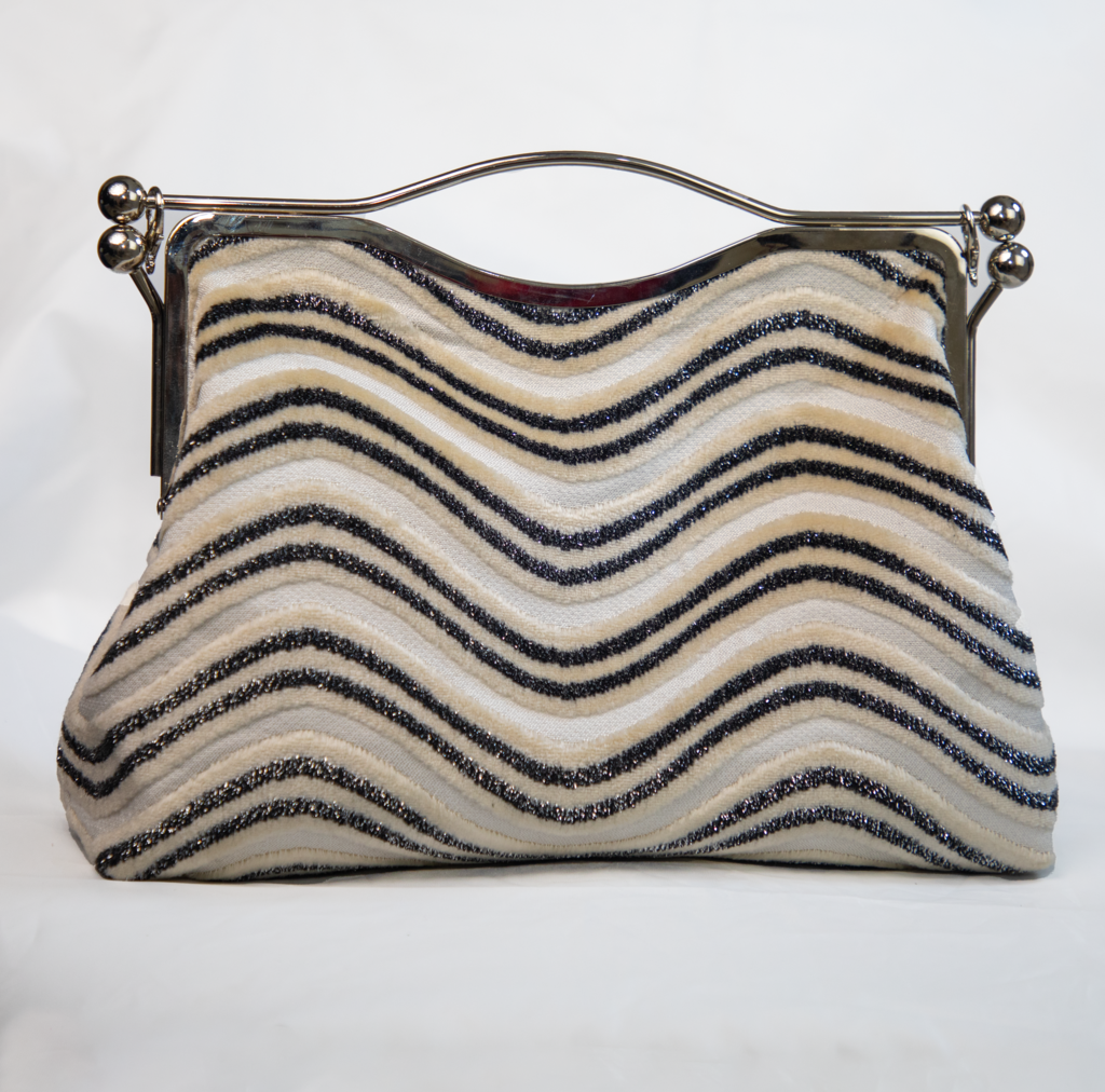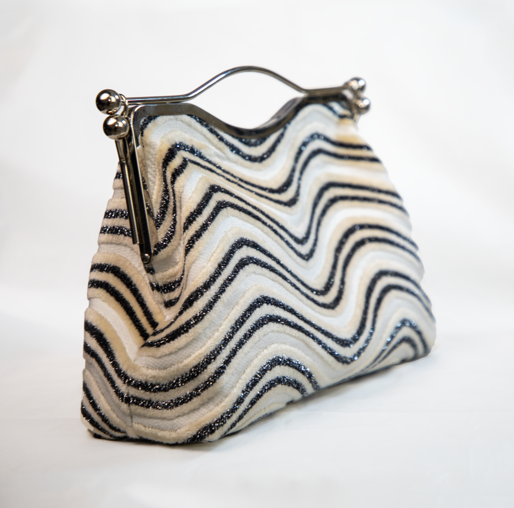 Un sac graphique et moderne en velours beige à rayures ondulées noires pailletées, rehaussé d’une poignée rigide métallique argentée. Élégant, audacieux et lumineux.